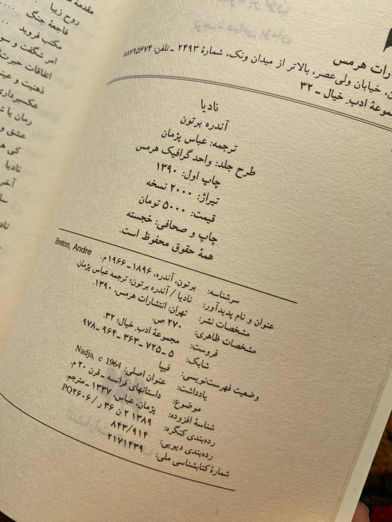 نادیا /نوشته آندره برتون /نشر هرمس/ ترجمه عباس پژمان/ چاپ ۱۳۹۰ /چاپ اول/ تعداد صفحه ۲۷۰ /