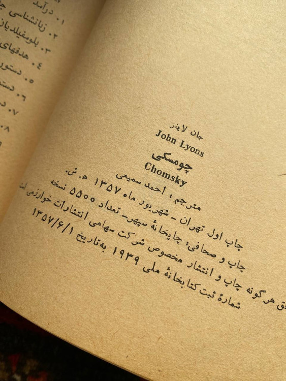 چومسکی/ نوشته جان لاینز / ترجمه احمد سمیعی/ انتشارات خوارزمی/ جلد شومیز با لبههای برگردان/ چاپ اول ۱۳۵۷ /کاغذ کاهی/ تعداد صفحه ۱۴۸/