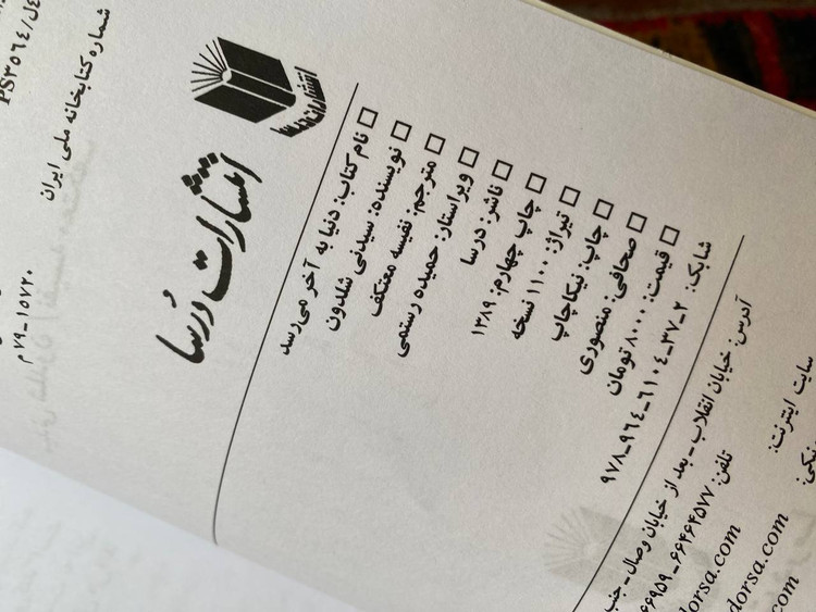 دنیا به آخر میرسد نوشته سید میشلدون ترجمه نفیسه معتکف انتشارات درسا چاپ چهارم ۱۳۸۹ جلد شومیز کاغذ سفید تعداد صفحه ۴۶۴