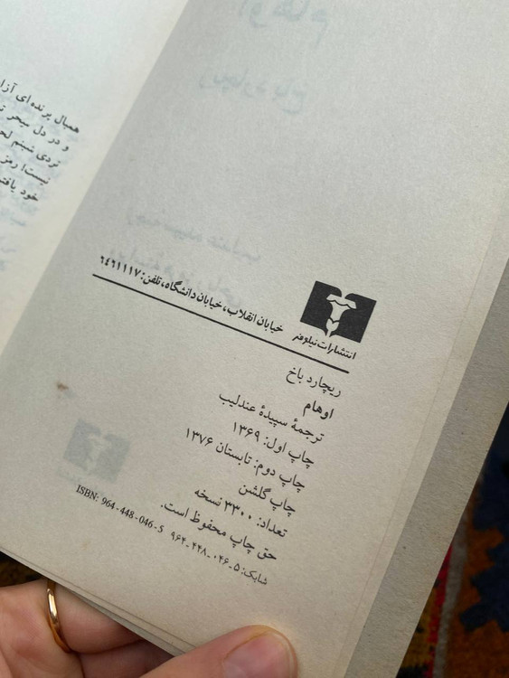 اوهام نوشته ریچارد باخ انتشارات نیلوفر چاپ ۱۳۷۶ ترجمه سپیده عندلیب جلد شومیز کاغذ کاهی تعداد صفحه ۱۵۲