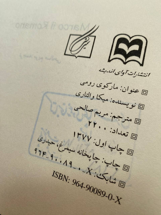 مارکو رومی نوشته میکا والتاری ترجمه مریم صالحی انتشارات آوای اندیشه چاپ اول ۱۳۷۷ سایز کتاب وزیری جلد گالینگور کاغذ کاهی تعداد صفحه ۵۱۱