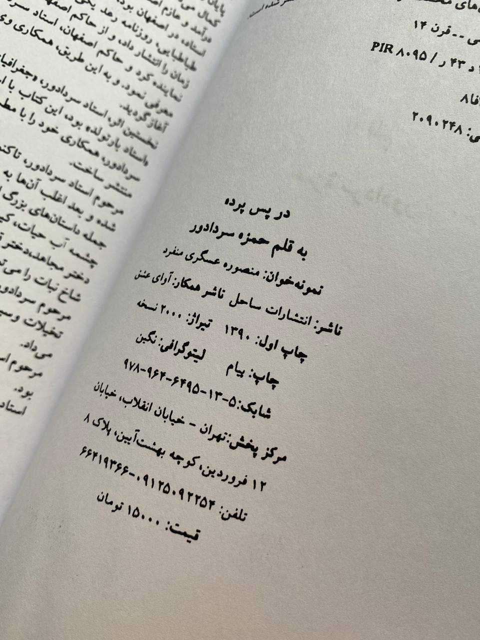 در پس پرده رمانی پرحادثه و رازآلود از حمزه سردادور است که با فضایی معمایی و خیالانگیز آغاز میشود. داستان با آشنایی راوی با جوانی شروع میشود که باور دارد از طریق رؤیاهای صادقه، مکانهایی را پیش از دیدن در واقعیت شناخته و از وجود گنجی پنهان در کاروانسرایی در مسیر خراسان خبر دارد. پدر او به امید شفای پسر و زیارت امام رضا، همراهش راهی سفری پرماجرا میشود؛ سفری که جستوجوی گنج و کشف رازها را در دل خود دارد.